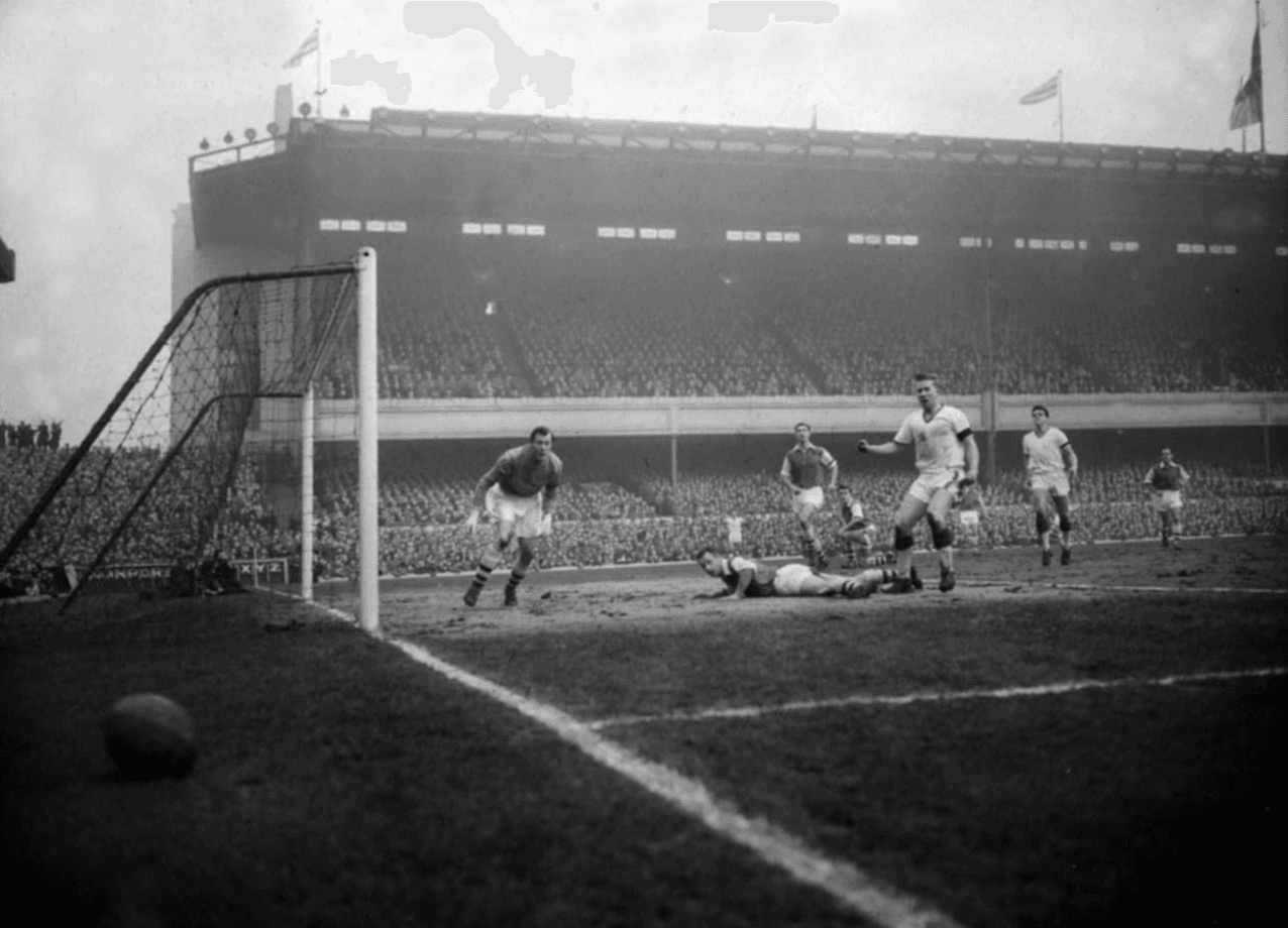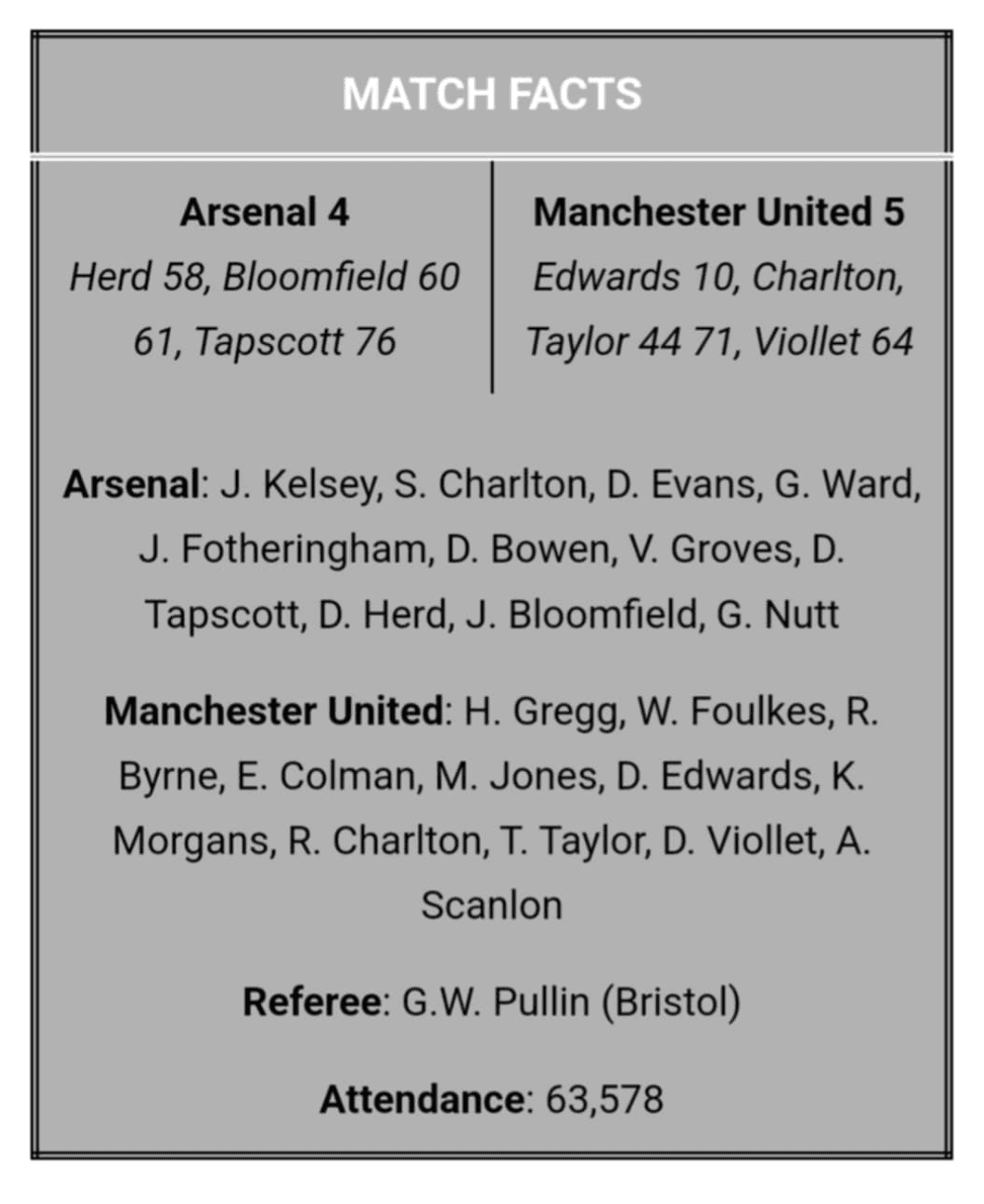Тяхната скорост остави плахото нападение на Арсенал без отговор още до почивката. Първо, Едуардс напредна и вкара под закъснелия плонж на Келси, след пас от Морганс. Това беше след десетата минута. До средата на полувремето Арсенал вече бе организирал контраатака и именно тогава дойде типичният отговор на Манчестър. В единия край на терена Грег, със светкавична скорост, направи изключително спасяване при удар с глава на Гроувс. От неговото изчистване Сканлън измина 70 ярда по левия фланг, преследван през цялото време от Тапскот на пълна скорост. Центрирането дойде навреме, а Чарлтън разстреля топката във вратата. Бам. Вместо 1:1, резултатът стана 2:0 за Юнайтед, а преди края на полувремето вече беше 3:0, когато Тейлър реализира подаване на Морганс. Междувременно Чарлтън вече бе лишен от два сигурни гола заради впечатляващи намеси на крайните защитници на Арсенал, прикриващи безпомощния си вратар.